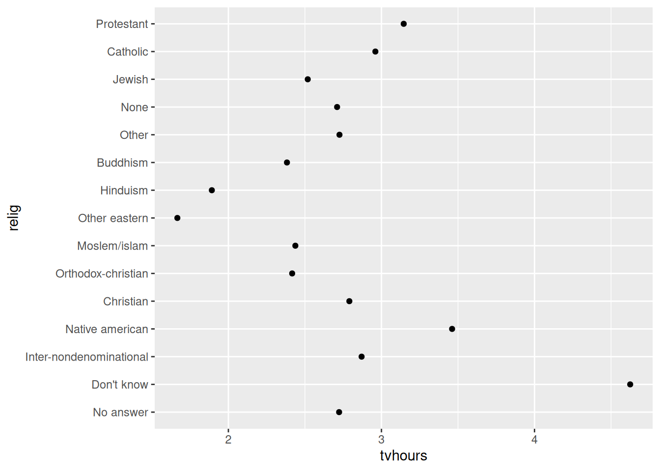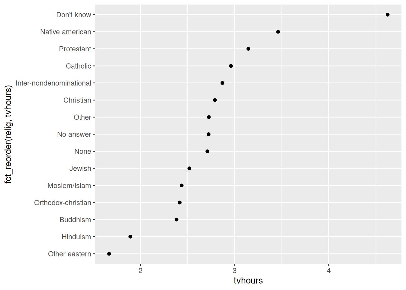 Tal problema, pode ser rapidamente resolvido ao aplicarmos a função fct_reorder() sobre a variável no eixo y, para que ela seja reordenada de acordo com os valores da variável do eixo x do gráfico. Perceba abaixo, que agora temos uma facilidade muito maior em comparar e classificar os vários tempos médios gastos em cada grupo religioso. Com essa nova ordenação, podemos rapidamente identificar que as pessoas que não sabem (“Don’t know”) a sua religião (ou que são ateus), são aquelas que mais gastam seu tempo em frente a uma televisão.