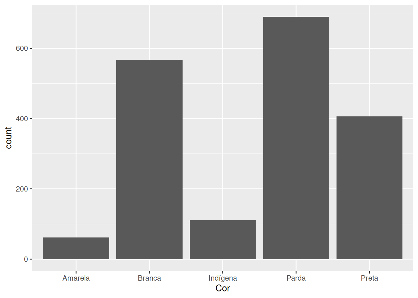 Por exemplo, se gerarmos um gráfico de barras a partir de cada cor de pele presente em nossa tabela datasus, temos o seguinte resultado: